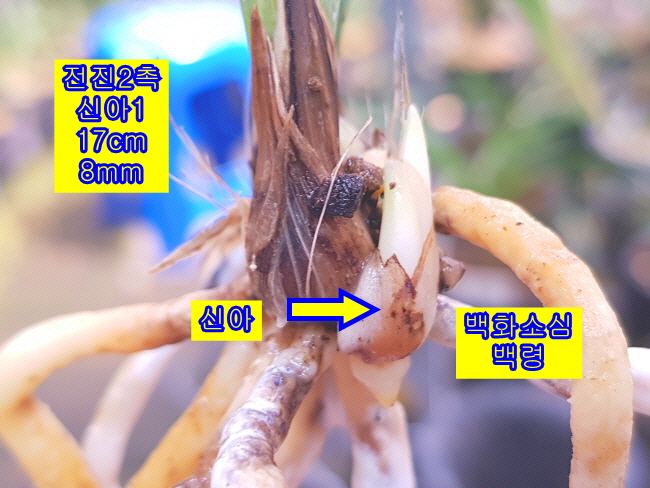 백화소심 백령입니다. 국내 백화소심 대표로 자리매김한 품종입니다. 초기 화통과 개화시 늦게 벗기시에 따라 순백색 개체입니다.
