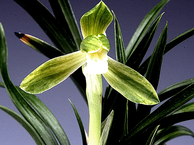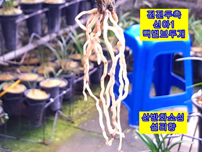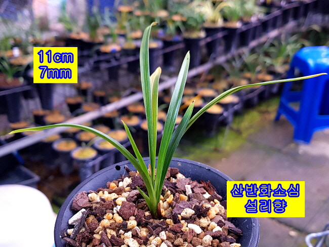 산반소심화 설리향입니다. 꽃잎마다 화려한 흰색 산반무늬가 잘 묻어, 짙은녹색 꽃잎 바탕과 잘 어울러진 산반화 소심입니다. 화려한 무늬와 순백색의 설판이 이루는 조화가 좋은 매력적인 꽃입니다.