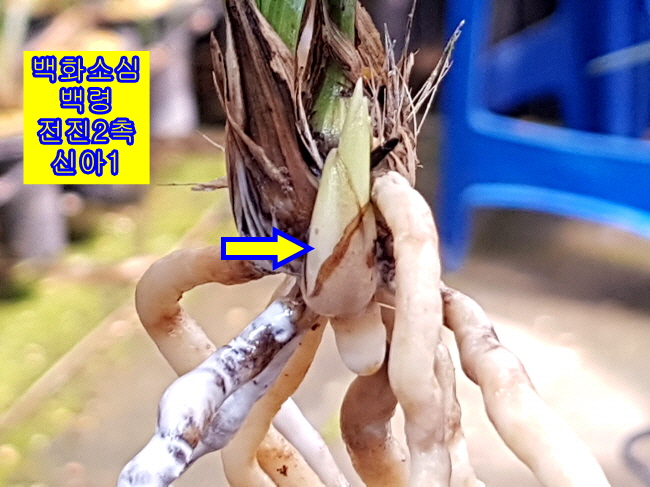 백화소심 백령입니다. 국내 백화소심 대표로 자리매김한 품종입니다. 초기 화통과 개화시 늦게 벗기시에 따라 순백색 개체입니다.