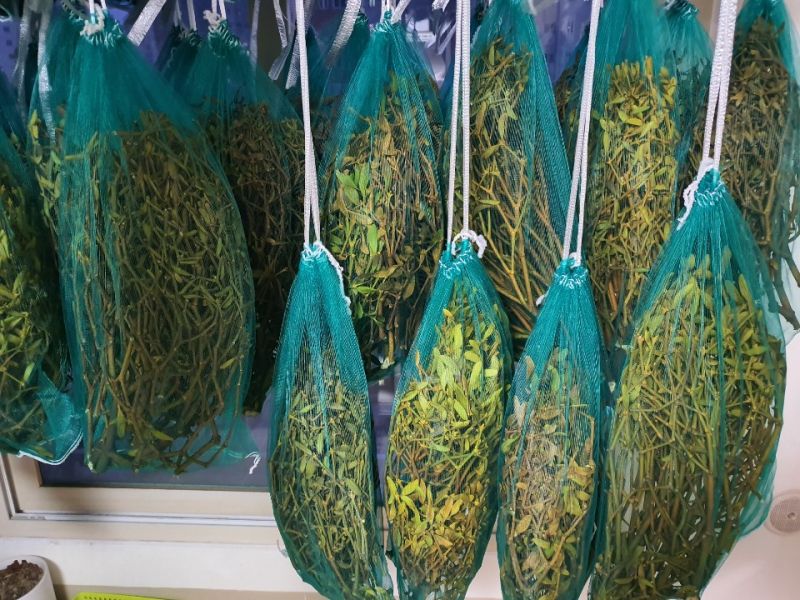 1월에 채취해 1kg식 망에 넣어 빨래 건조대에 매달아 놓다보니 80%는 건조되어 무게가 반도 넘게 줄어 들었네요.