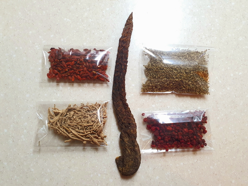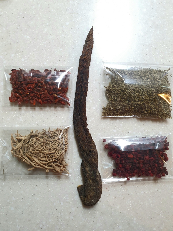 오미자, 구기자, 사상자는 국내산 재료이며 원지와 육종용은 내몽고산 입니다