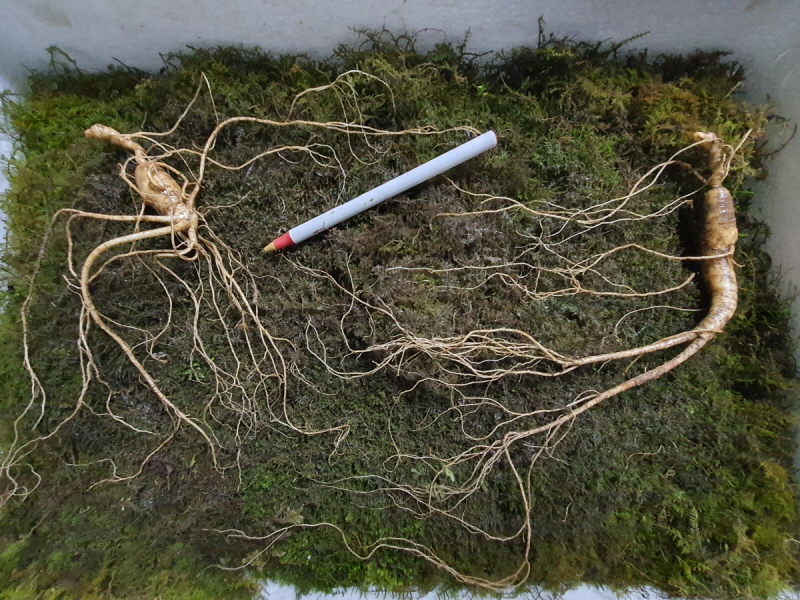 상위 1% 극 소수로 나오는 미 좋고 크기 좋은 A급 8년근 대짜 산양삼 두 뿌리 입니다