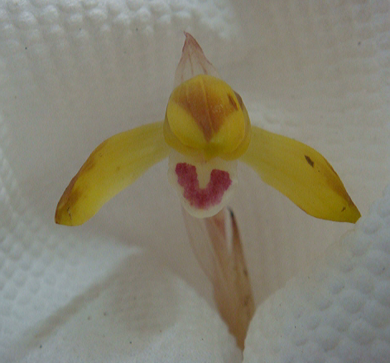 본 품종은 전남 에서 산채된 황색화로 화근이 없으며, 아주 깨끗한 황화로 설판은 약간 색설을 닮았습니다. 잡색이 없는 백판설에 붉은색이 넓게 자리한 설점이 인상적입니다.