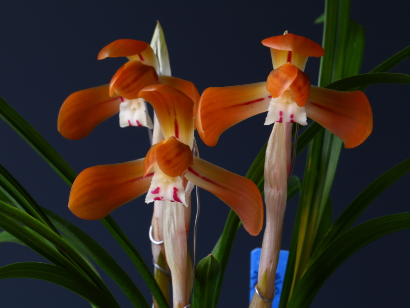 짙은 선홍빛이 기부부터 녹을 밀어내고 점차 짙어지는 홍화이며 화형또한 단